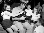 Two pairs of twins, Marian, left, and Judy Ryan, are with a kneeling Bobby and Dick Greenman. The children are watching a baby chimp, which is held by Clyde Smith, who has raised the little animal. Martian, Judy, Bobby, Dick, and Clyde are shown surrounding Mr. Smith and the baby chimp. Published in Fort Worth Star-Telegram morning edition June 10, 1951.