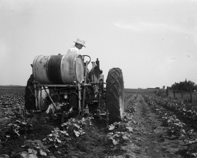Mike Neu, 13-year-old Gainesville 4-H Club boy, makes a test run on his club project cotton before deciding it was too wet to plow and spray flea hoppers and bollweavils that are showing up in large numbers. This is the same problem encountered by farmers over a large portion of Noth Texas after a series of light rains along with mud, grass and insects. Published in Fort Worth Star-Telegram morning edition June 27, 1951.