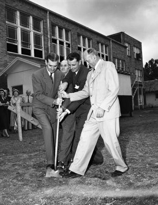 The first spadesful of earth for the new Riverside Methodist Church, at 326 North Riverside Drive, was turned by, left to right, Reverend G. Alfred Brown, district superintendent; Reverend Allen A. Peacock, pastor; C. Ray Stokes, chairman of stewards; and W. H. Bogart, building committee member. Published in the morning edition, June 9, 1951.