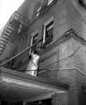 Dr. J. C. Stobaugh, Weatherford dentist, is shown handling office equipment out of the window of the burning Hopkins Building at Weatherford to James D. Barclay, 1619 May, Fort Worth. Barclay was passing through the town Sunday after a fishing trip and stopped off to help fight the fire which resulted in losses estimated at more than $600,000. James D. Barclay is seen to standing at the left of the window and Dr. J. C. Stobaugh is seen to the right. Published in Fort Worth Star-Telegram evening edition June 4, 1951.