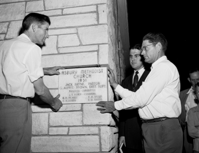 Cornerstone of the new $25,000 Austin stone chapel of the Asbury Methodist Church at 2908 Layton Ave, Haltom City, Texas was laid. Cecil Dowdy, left, and Paul Brown, right, building committee members, are shown placing the stone while Reverend Payne watches. Cecil Dowdy, Paul Brown and Reverend Jack Payne can be seen holding the cornerstone. Published in Fort Worth Star-Telegram evening edition June 4, 1951.