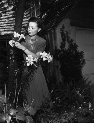 Mrs. Walter Gordan Sharratt, daughter of Mr. and Mrs. J. J. Patterson, 112 Westview, left Saturday by plane accompanied by her father, for Havre de Grace, Maryland, where she will join her husband, Lieutenant Sharratt, who is stationed at Aberdeen Proving Grounds. Mrs. Sharratt is holding flowers in a garden.