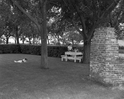 Sharon Thompson is shown here in the "outdoor living room" in one corner of the large, well-kept lawn which fronts the Thompson home. At extreme right is the barbecue pit. Published in Fort Worth Star-Telegram July 1951.