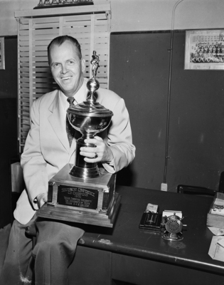 Texas Christian University Frog Cage Coach Byron (Buster) Brannon holds the trophy awarded to Texas Christian University for finishing in a three-way tie for the Southwest Conference basketball championship. The Frogs deadlocked with University of Texas and Texas A&M. Published in Fort Worth Star-Telegram morning edition June 6, 1951.