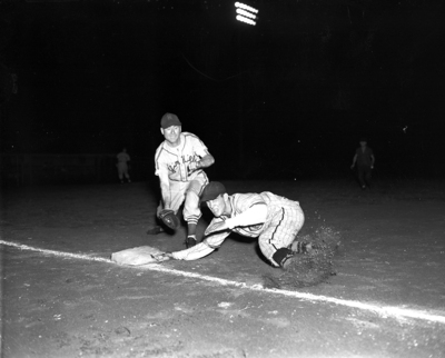Convair's Robert Williams apparently expects the worst but gets back to first safely as Jim Hill's Mel Harden tries for pickoff in game at Rockwood Park. Jim Hill won, 10-1. Published in Fort Worth Star-Telegram evening edition, June 15, 1951.