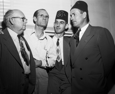 New candidates were initiated into Azotos Temple 175, Knights of Pythias. Left to right, Tol Thomas, M. M. Curtis, were initiated by Lern Lacey, of Denison, Texas, deputy imperial prince of District 25 and Albert Parish, royal vizier of the temple. Published in Fort Worth Star-Telegram morning edition June 5, 1951.