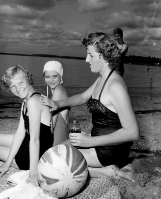 Barbara McCurry, lifeguarding for the Birdville Future Homemakers Club during their outing on Eagle Mountain Lake, applies soothing oil to the sunburned back of Bobbie Woods, daughter of Mr. and Mrs. W. R. Woods, 3408 Sunday, as Wanda Holder, daughter of Mr. and Mrs. J. B. Holder, 2912 Haltom Rd, waits her turn. Barbara's parents are Mr. and Mrs. D. F. McCurry, 5708 Ellison. An unidentified female can be seen behind Bobbie Woods, Wanda Holder and Barbara McCurry. Published in Fort Worth Star-Telegram morning edition June 6, 1951.
