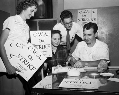 Picket captains for Communications Workers of America Local 6201 worked late into the night to get ready to set up picket lines. At strike headquarters at 1204 1/2 Main are, left to right, Mrs. Henrietta Hightower, operator; Miss Moahdeena Rusk, clerk in the division office; Arthur Dickerson, commercial department communications representative, and Don Looney, switchman. Published in Fort Worth Star-Telegram morning edition June 5, 1951.