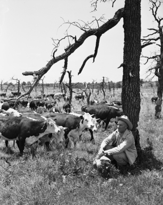 Henry S. Bryson checks a group of young Hereford Heifers on his 3,000-acre Jack County ranch. Published in Fort Worth Star-Telegram July 1951.
