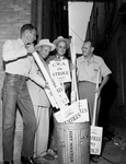 The picket signs are being thrown to the trash at the Communications Workers of America Strike. Chucking them in, left to right, are Charlie Holland, picket captain; Wallace R. Eddings, city strike director; R. A. Miller, publicity chairman for the local; and T. C. Davenport, president of Local 6201. Charlie Holland, Wallace R. Eddings, R. A. Miller ad T. C. Davenport can be seen holding strike picket signs. Published in Fort Worth Star-Telegram evening edition June 5, 1951.