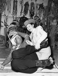 Roped and tied - Miss Evalene Dampier of Tunas, Missouri, who thinks all Texans are liars since one jilted her, gets a lesson in roping a Texas man from Bill Forrest, president of the Madisonville Sidewalk Cattlemen's Association.