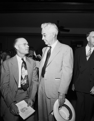 At Methodist meeting - F. Hadel, left, Crawford Methodist layman, meets Dr. Robert Armor of San Antonio, superintendent of the Texas Missionary Home and Training School, at the Central Texas Conference meeting in Waco.