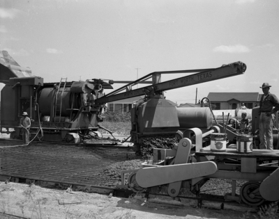Mobile paving equipment of Worth Construction Company is roughing in concrete on the north lane of the East-West Expressway more than 1,000 feet east of South Merrick St. Sufficient steel is on hand for both lanes of the contract from Horne at Camp Bowie to Montgomery, but a cement shortage may delay start of the paving of the south lane. Paving equipment and an unidentified man can be seen to the right in the photograph. Published in Fort Worth Star-Telegram evening edition June 7, 1951.