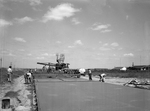 While heavy mobile machinery is layering concrete on the north lane of the East-West Expressway 1,000 feet east of South Merrick St. at the rate of 1/4 mile per day, manual labor is used to add the final touch. The two workmen are shown rippling the concrete with a heavy cloth. Paving from Horne at Camp Bowie to Montgomery is being done by Worth Construction Company. Texas Bitulithic Company holds contract from Montgomery east to Summit. Laborers are shown rippling the concrete with a heavy cloth in the photograph. Published in Fort Worth Star-Telegram evening edition June 7, 1951.