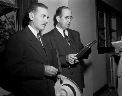 At the Central Texas Methodist Conference, left to right, Reverend G. Alfred Brown, Fort Worth district superintendent, and Reverend Pat Brown of Hillsboro were in attendance. Reverend G. Alfred Brown and Reverend Pat Brown are shown holding a folder in hand. Published in Fort Worth Star-Telegram morning edition June 7, 1951.