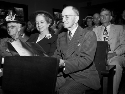 At the Central Texas Methodist Conference, left to right, Dr. A. L. Thomas, Ennis layman, and Mrs. Leslie Seymour of Cisco, wife of the district superintendent are seated on a bench. An unidentified woman can be seen to the left of Mrs. Leslie Seymour. Published in Fort Worth Star-Telegram evening edition June 7, 1951.
