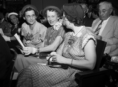 At the Central Texas Methodist Conference, Mrs. Floyd Campbell of Hamilton at the left, Mrs. Blond Powell of Oglesby, center, and Mrs. Anna Lee Johnson of Oglesby can be seen speaking to each other. Published in Fort Worth Star-Telegram evening edition June 7, 1951.