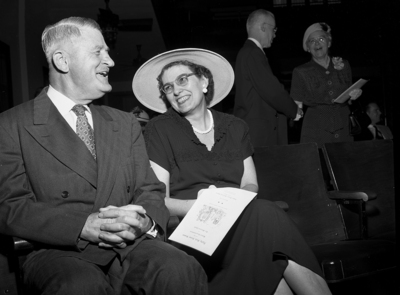 At the Central Texas Methodist Conference, Mrs. C. H. Sisserson of Cleburne, right, wife of the district superintendent, and Reverend J. I. Patterson, pastor at Graham and former pastor of Meadowbrook Methodist of Fort Worth. Published in Fort Worth Star-Telegram evening edition June 7, 1951.