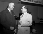 At the Central Texas Methodist Conference, Laymen H. O. Whitehurst, left, Groesbeck superintendent of schools, and at the right, Harold Dennis of Mineral Wells are shown engaged in conversation. Published in Fort Worth Star-Telegram evening edition June 7, 1951.