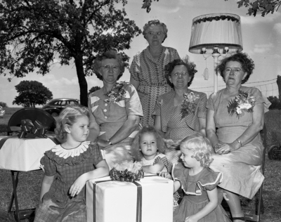 "The Diary Queens" as the Lotspeich sisters of Tate Springs community affectionately are called by their neighbors, were honored at a community gathering. Pictured with the sisters, left to right, Misses Della, Bobbie and Bertie Lotspeich, are three eager little neighbors, left to right, Gail Ann Brannon, Ann Tinsley and Martha Nell Bratcher; and Misses Lotspeich's sister, Mrs. George Davis of Arlington, standing. Published in Fort Worth Star-Telegram evening edition June 7, 1951.