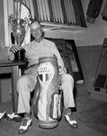 L. W. (Smiley) Rowland, Glen Garden pro and newly elected president of the Texas Professional Golfer Association (PGA), exhibits his trophies from the tournament at Amarillo. The cup represents the senior championship of the PGA. The bag is a gift from the Mexican delegation which played a Texas team. L. W. Rowland is shown holding the trophy and the bag that was gifted to him. Published in Fort Worth Star-Telegram evening edition June 7, 1951.