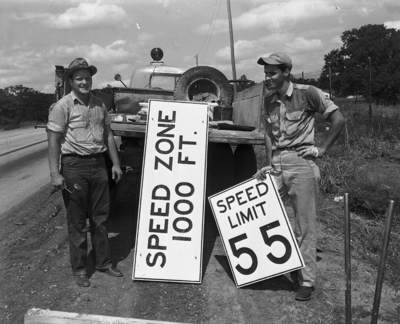 State Highway Department workers W. H. Hogue, left, of Grapevine, and R. B. Aubrey of 6008 Locke, were installing new 55-mile-per-hour speed zone signs Friday west of Arlington's west city limits to near Village Creek.