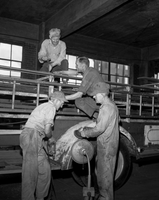 A team of fire department mechanics is building a fire truck instead of buying one. The mechanics are, left, to right, George Tidball, Theo Sparks, Glenn Pittman and Don Young, chief mechanic. George Tidball, Theo Sparks, Don Young and Glenn Pittman is shown working to build the fire truck. Published in Fort Worth Star-Telegram evening edition June 9, 1951.