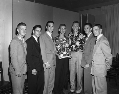 Receiving SSA gold keys for being chosen the best in scholarship sportsmanship and athletics at their respective schools Friday at the Optimist Club's noon luncheon at Blackstone Hotel are, left to right, Jimmy Stapleton, Amon Carter Riverside; Walter Thomas, Diamond Hill; Don Hughes, Handley; Johnny Caruthers, Poly; Joe Hardgrove, Paschal; Edward (Toppy) Ponder, North Side, and Bob Harden, Tech. Gene Records of Arlington Heights was not able to attend.