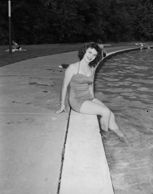 Portrait of Miss Carmen Hinds, baton twirling instructor for the Recreation Department, beats the heat with a dip at Forest Park pool.