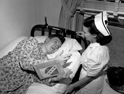 Marvin Padgett, Jr., recovering from minor surgery at All Saints Hospital, tells Nurse Helen Balentine that firecrackers are dangerous. He is recalling his accident of four years ago which left him blind in one eye, and deaf in one ear. Marvin Padgett, Jr. is shown laying on bed while he speaks to the nurse. Published in Fort Worth Star-Telegram evening edition June 9, 1951.