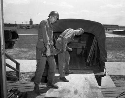 Two members of the 249th Tank Battalion (Heavy) of the 49th Armored Division load up the barrel and receiving housing of a.50 caliber machine gun at Eagle Mountain Lake National Guard Base for transport to Camp Polk, Louisiana, for two weeks summer training. At left is W. J. Roscoe, 27, of Saginaw, tank driver, and at right, Sergeant James W. Smith, 22, of 3615 E. 4th. W. J. Roscoe and James W. Smith can be seen loading a truck for the trip. Published in Fort Worth Star-Telegram evening edition June 9, 1951.