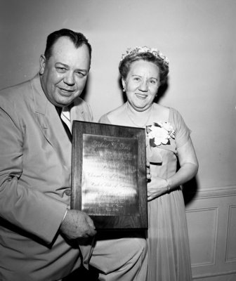 D. A. Hulcy, new president of Chamber of Commerce, on the left is posed with an unidentified woman. He is holding a plaque.