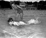 Richard Briscoe, 8, seems to be enjoying his Red Cross swimming lesson at Forest Park pool while instructor Helen Youngblood watches. Richard Briscoe can be seen swimming in the water under the guidance of his instructor. Published in Fort Worth Star-Telegram morning edition June 10, 1951.