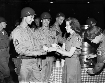 Staff Sergeant Richard C. Scoggins of Denton, center, cocks an appraising eye at Miss Barbara Eastus, as the Red Cross canteen worker hands him and Sergeant First Class Weldon Judkins of Denton coffee at the T&P Station. The two National Guardsmen were among a group of 49th Armored Division Troops. Miss Barbara Eastus can be seen holding two cups in her hands. Published in Fort Worth Star-Telegram morning edition June 10, 1951.