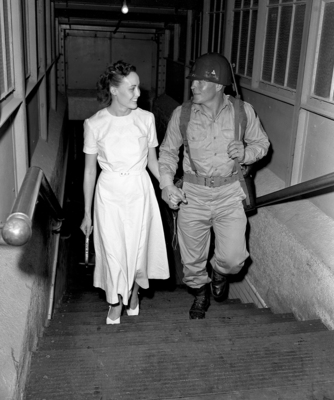 Last Sergeant and Mrs. V. B. Shaw of Decatur, Texas can be seen holding hands as they walk up the stairs.