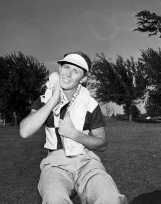 Image shows Don Matheson, Colonial member, wiping his face with towel after being eliminated in the Trans- Mississippi quarter finals at Dallas. Published in the Fort Worth Star-Telegram morning edition June 10, 1951.