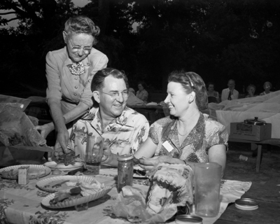 Among 140 attending the Warren-Dison family reunion at Trinity Park were Archie Wiles Senior of Oklahoma City, retiring president of the family group, and Mrs. Juveline Hill, who traveled 1,635 miles by train from Bakersfield, California. Serving them was Mrs. L. E. Thomas of 3508 Thannisch, the oldest family member at the reunion. Mrs. Juveline, Archie Wiles and Mrs. L. E. Thomas are shown dining at a table. Published in Fort Worth Star-Telegram morning edition June 11, 1951.
