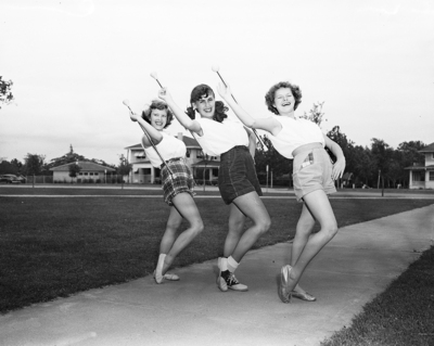 Three West Texas students strut across the Texas Christian University campus, training for high school majorette roles. They are, left to right, Barbara Harral, Abernathy; Colleen Soles, Synder, and Allana Ledbetter, Odessa. The three identified women are shown twirling batons. Published in Fort Worth Star-Telegram morning edition June 12, 1951.