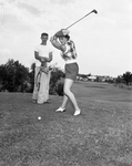 Image shows Johnny Dunn, Worth Hills, left, teaching Alice Langford, right, swinging golf club. Dunn is a former Texas Christian University, grid man, now stationed at Carswell Air Base. Published in the Fort Worth Star-Telegram morning edition June 10, 1951.