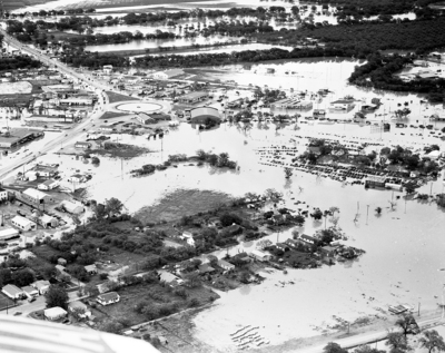 Extent of flood waters at Brownwood shown near traffic circle at north section of town. Note vehicles submerged in right foreground and poles and buildings protruding from watery footings. About 300 persons were forced from their homes in lowlands when the flood struck. Published in Fort Worth Star-Telegram morning edition June 13, 1951.