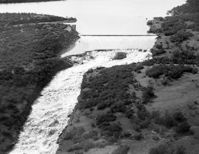 A wall of water, running about five feet high, gushes over Lake Brownwood dam spillway into Pecan Bayou after heavy rains put Brownwood under a blanket of floodwaters in lowland sections. About 300 person were driven from their homes. Published in Fort Worth Star-Telegram morning edition June 12, 1951.