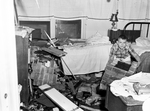 Eleven year old Butchie Scott tries to move part of a brick chimney that crashed through the roof of his bedroom at 804 Hemphill. The falling bricks fell within a foot of Butchie and his mother, Mrs. M. N. Vick, who was in the room closing windows against the rain and wind. Butchie Scott can be seen seated in his bedroom surrounded by roof scraps. Published in Fort Worth Star-Telegram evening edition June 12, 1951.
