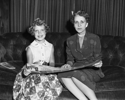 Mrs. J. Warren Day and her daughter, Diane, look over travel folders at their home, 3711 Westcliff Rd. N., in anticipation of a summer vacation in Canada. Mrs. Day recently was installed as president of the Canwick Club. Published in Fort Worth Star-Telegram evening edition June 12, 1951.