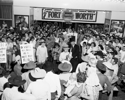 A crowd of 7,000 persons is estimated at World Premiere Action to watch a Judge Roy Bean Court staged by Texas Christian University students as part of the premiere activities. Published in Fort Worth Star-Telegram morning edition June 14, 1951.