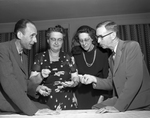 Four members of the Panther City Philatelic Society inspect new stamps before the annual banquet of the society at the Blackstone Hotel. Left to right, they are Bernard Lionberger, Mrs. Mary Krohn, Mrs. Myrtle Beckman and J. P. Agerton. Published in Fort Worth Star-Telegram morning edition June 17, 1951.