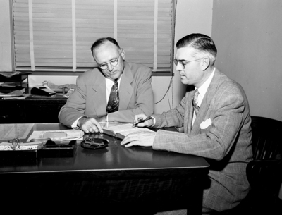 Chief of Police Roland R. Howerton, left, is shown counseling with his pastor, Reverend Woodson Armes, pastor of Polytechnic Baptist Church. Chief of police Roland R. Howerton and Reverend Woodson Armes are shown seated at a desk. Published in Fort Worth Star-Telegram evening edition June 16, 1951.
