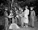 Boy Scouts from Troop 38, St. Mark's Methodist Church, raised the flag in Botanic Garden Flag Day ceremonies in an observance sponsored by the three Fort Worth chapters of the Daughters of the American Revolution. Left to right are Leo Valley, Coy Drennan, Scoot Merliott, Sam Smith, Mrs. F. H. Herman, and Terry Smith. Published in Fort Worth Star-Telegram evening edition June 14, 1951.