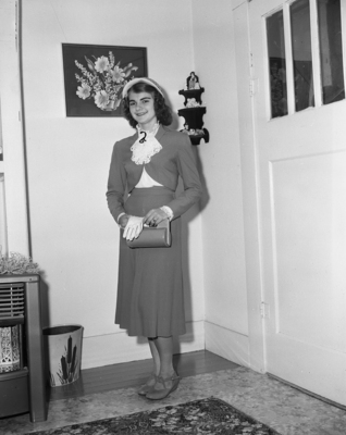 Marie Petty poses prettily in the dress which she made previously with which she won the dress review for 4-H girls in Howard County and went on to compete in the state contest. Published in Fort Worth Star-Telegram morning edition April 2, 1950.