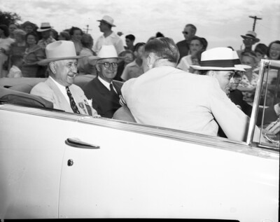 Amon G. Carter and John W. Carpenter of Dallas ride in back seat of a car, as Detective Lieutenant L. Sullivan of New York City and Fort Worth Chamber President Berl Godfrey are seen in the front seats, riding in the parade for General Douglas MacArthur.