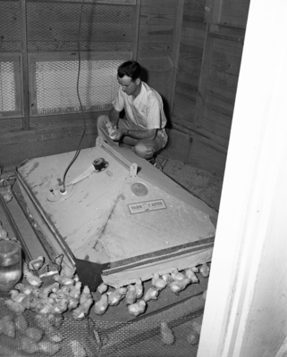 Image shows Russell Reed, superintendent of the broiler experiment station in Gonzales County, feeding chicks that are being tested for response to various types of feeding. Published in Fort Worth Star-Telegram morning edition April 2, 1950.